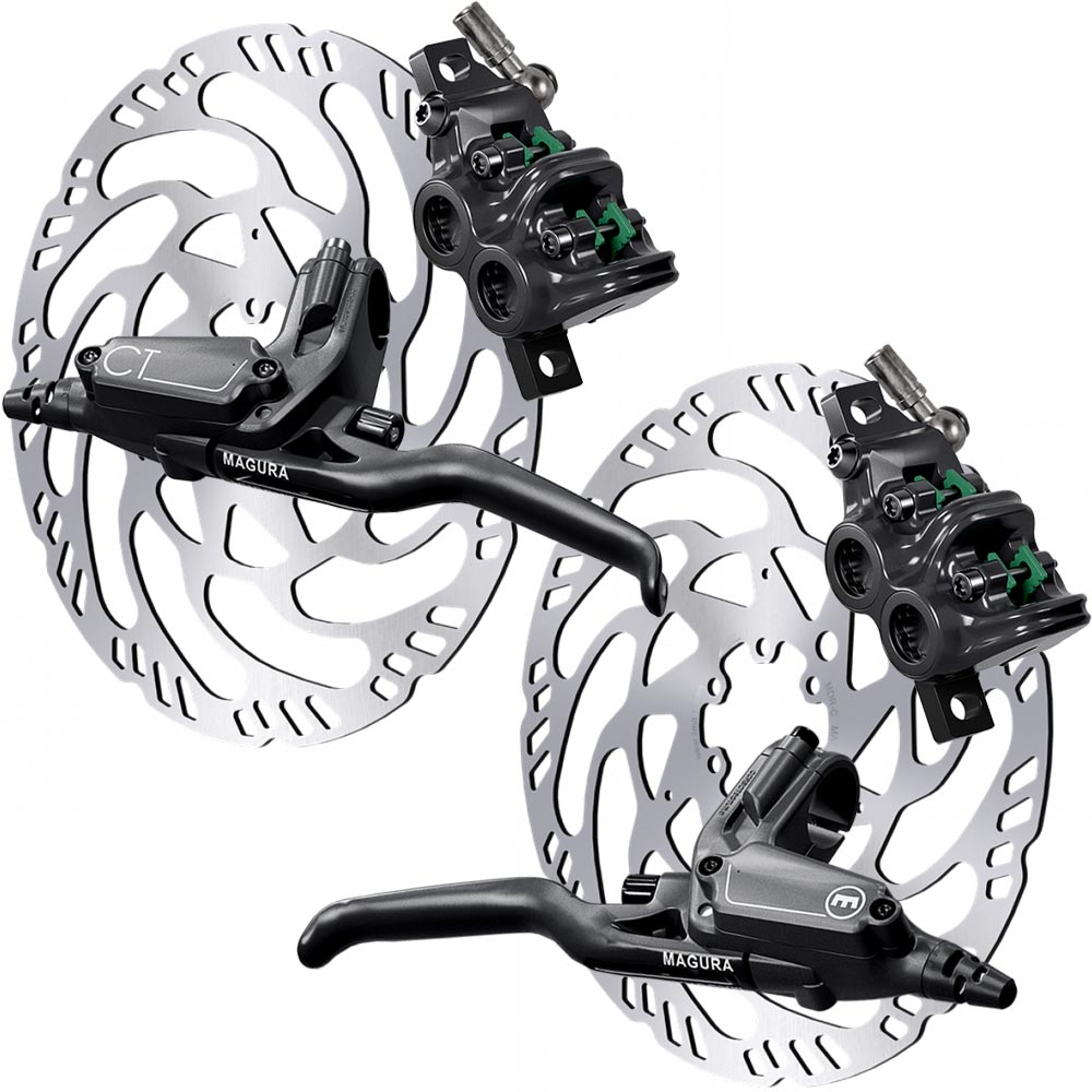 Die Powerbremse fuer Urban, Alltags Allroad und E Bikes , Magura CT 5 Discbrake mit 4 Kolben Bremssattel, Carbotecture Bremshebelgehaeuse. Das Uebersetzungsverhaeltnis und die Ergonomie der MAGURA CT sind perfekt auf die Anforderungen im City- und Allroad-Einsatz abgestimmt. Der komplett neu entwickelte Axialgeber der MAGURA CT setzt auf einen vergroesserten Ausgleichsbehaelter, der das Auftreten von Luft im System reduziert und eine langfristig einwandfreie Funktion gewaehrleistet. Das Setup mit langlebigen und leisen SPORT Bremsbelaegen unterstreicht die Sorglosigkeit.