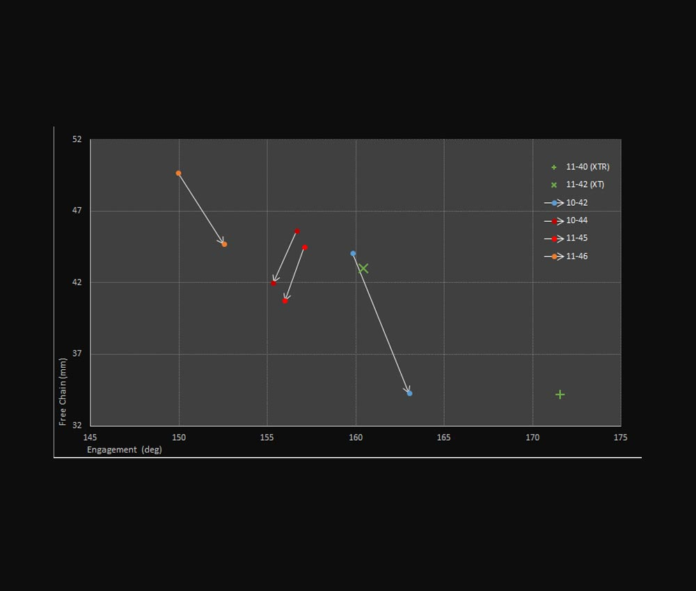 - Max Uebersetzungspanne: 11-46 / 10-45 / 9-44 Zaehne